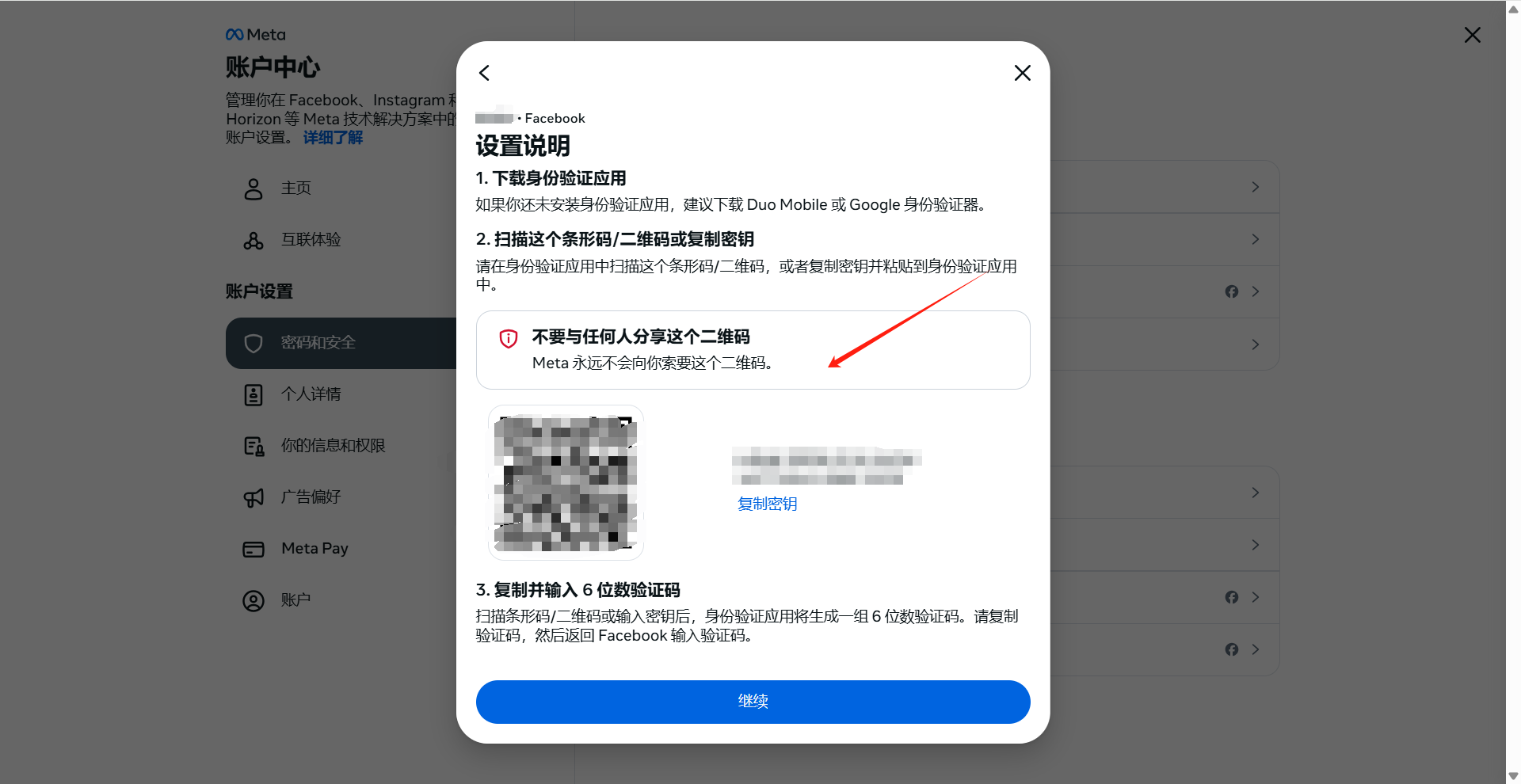 5.扫描对应生成的二维码,核对6位数密码后,完成双重验证设置