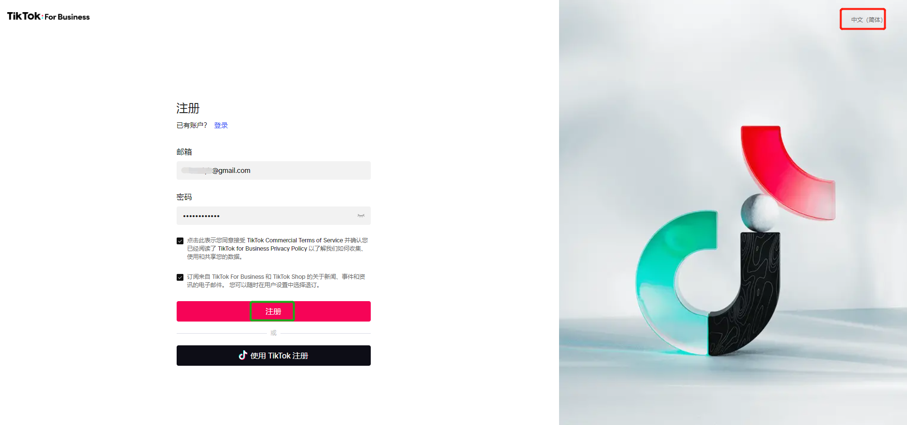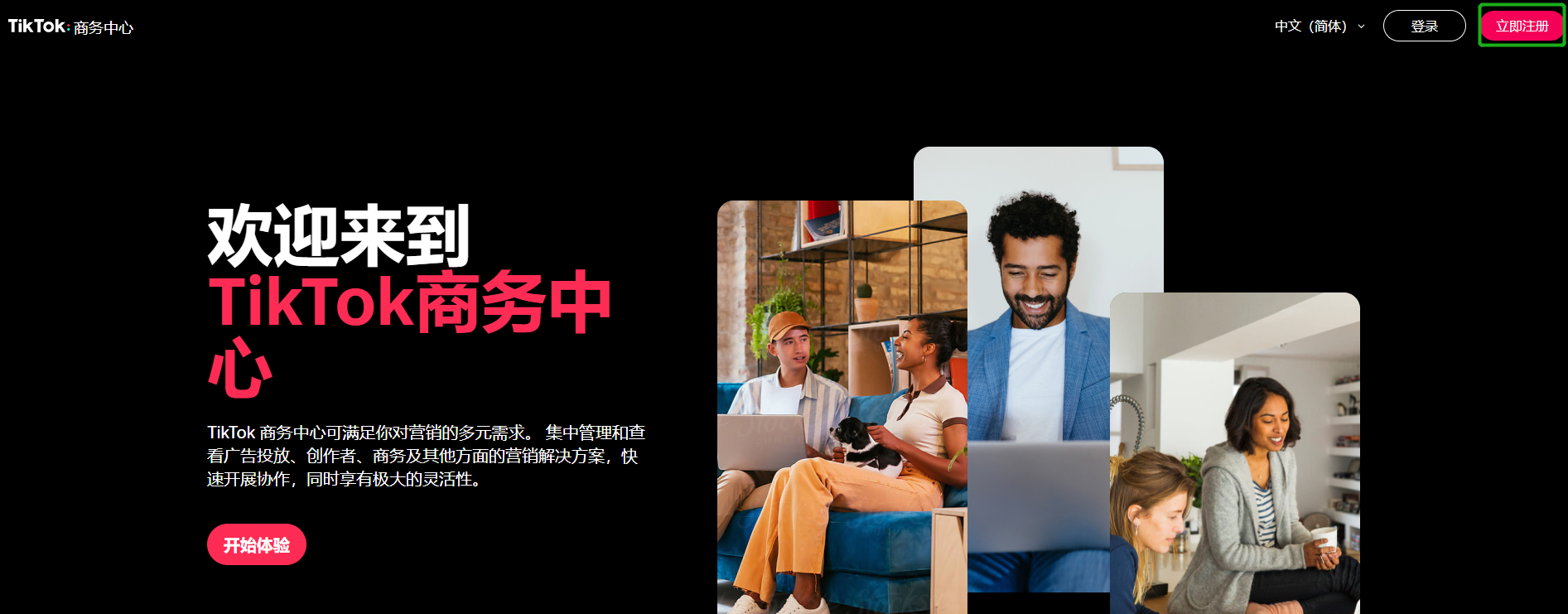 浏览器打开网址https://business.tiktok.com/zh,点击右上角立即注册