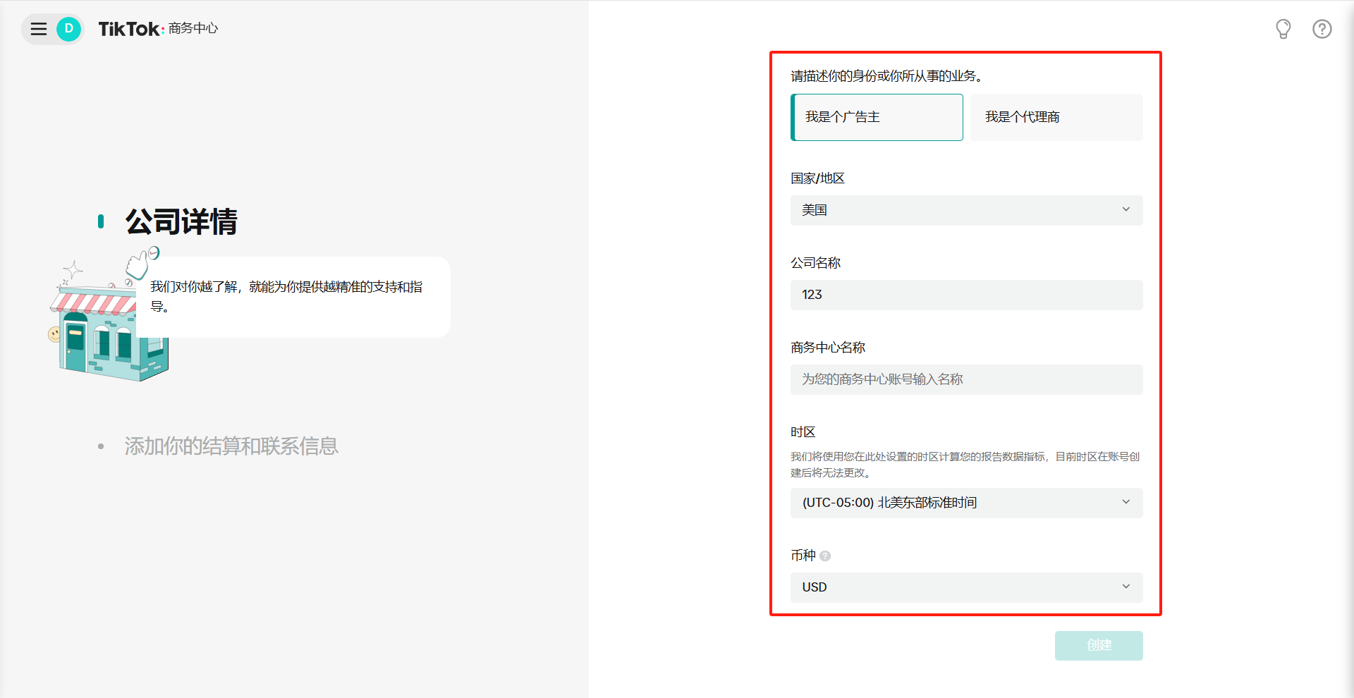选择我是广告主,国家/地区、公司名称、币种(默认USD)如实填写,商务中心名称(随便写,建议用公司名称或者品牌名称)和 时区(随便选,建议UCT+08),最后点下方的创建按钮